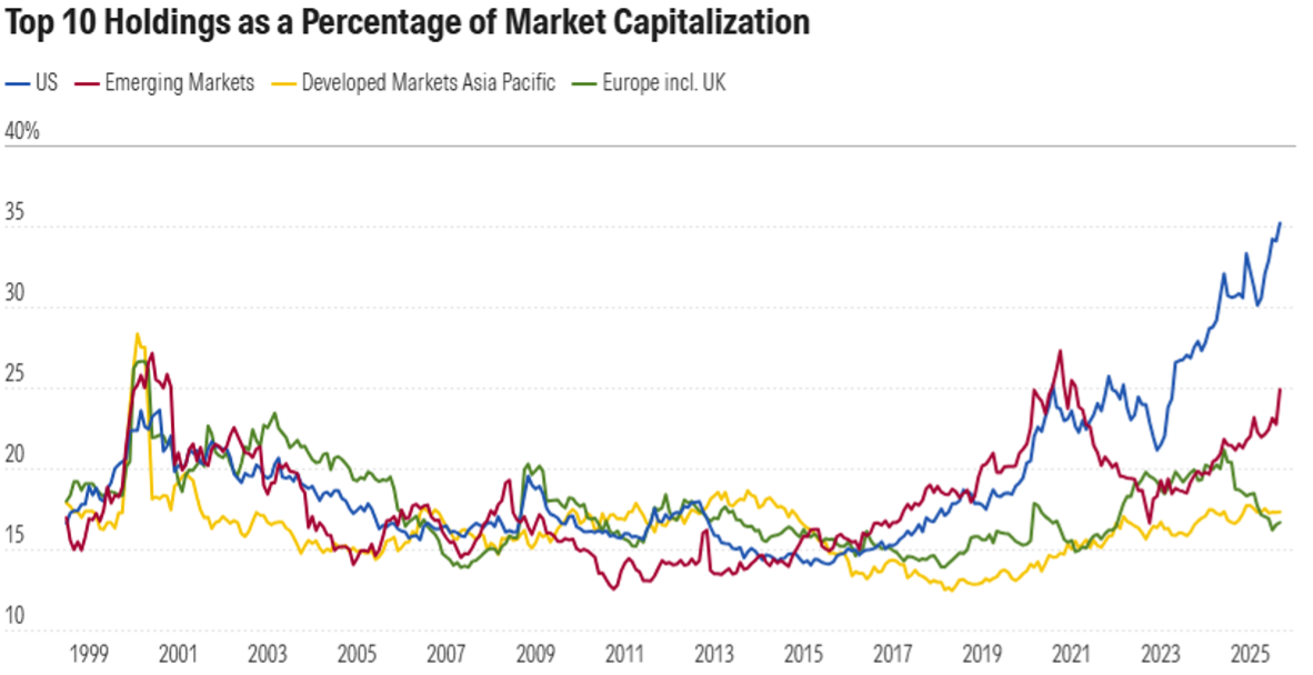 It is also important to consider the outsized role played by the so-called “Magnificent 7” – Alphabet (Google), Amazon, Apple, Meta Platforms (Facebook), Microsoft, Nvidia, and Tesla – in overall market performance. These companies collectively represent roughly one-third of the S&P 5002, making their performance a dominant driver of index-level returns. As shown in the graph below, the top 10 US stocks now account for roughly 35% of the overall market – up from just 18% a decade ago.