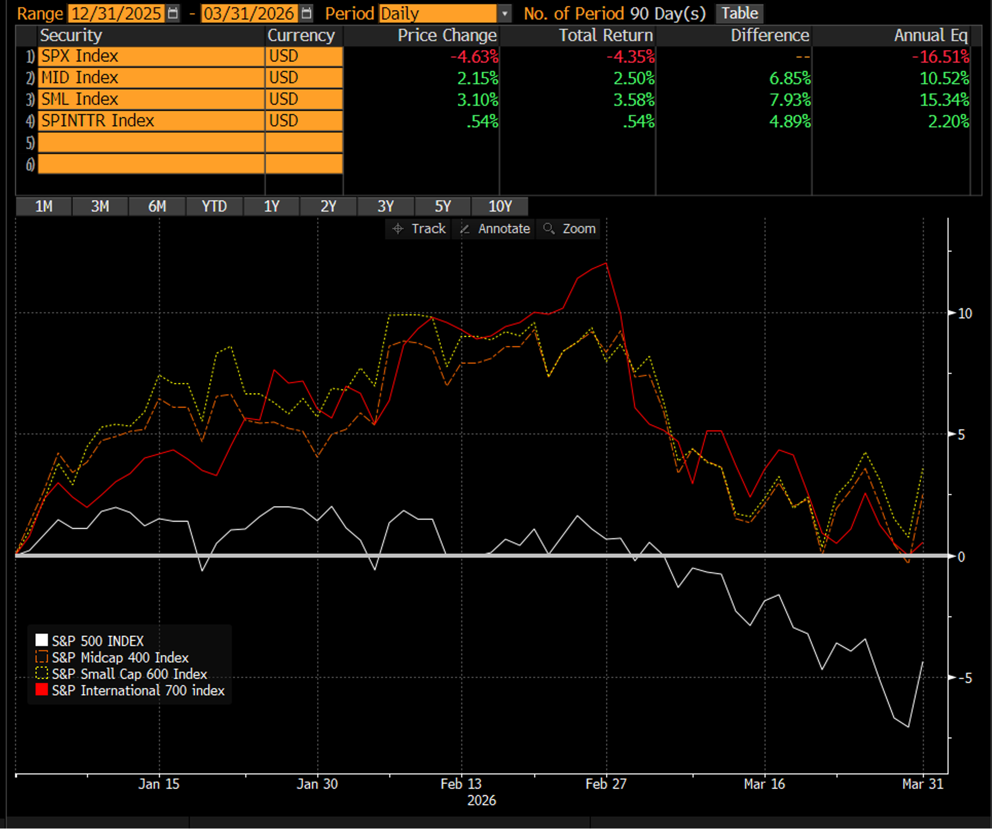 The first quarter started with a continuation of the rally from last quarter across U.S. and global markets and maintained that momentum until late February, when the markets headed south as “Operation Epic Fury” commenced with an attack on Iran by the joint efforts of the U.S. and Israeli military forces. All markets, except for the S&P 500 (U.S. large-cap market), found support near the end of the quarter as it appeared most of the military objectives had been obtained with minimal damage inflicted by the Iranian retaliatory attacks. The S&P 600 Small Cap index, the S&P 400 Mid Cap Index, and the S&P International 700 Index all ended the quarter with positive returns of 3.58%, 2.50%, and 0.54%, respectively, while the S&P 500 index posted a loss of 4.35%.