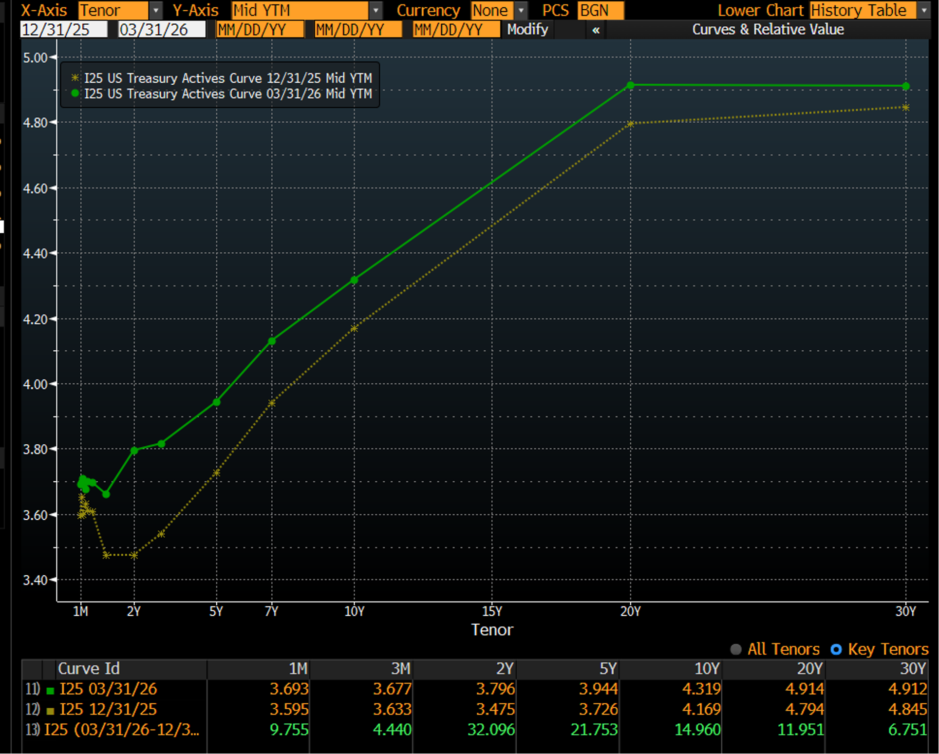 As of the end of the first quarter, the 3-month T-Bill yield rose from 3.595% to 3.693% vs the 10-year U.S. Treasury, which rose by almost 15 bps from 4.169% to 4.319%.